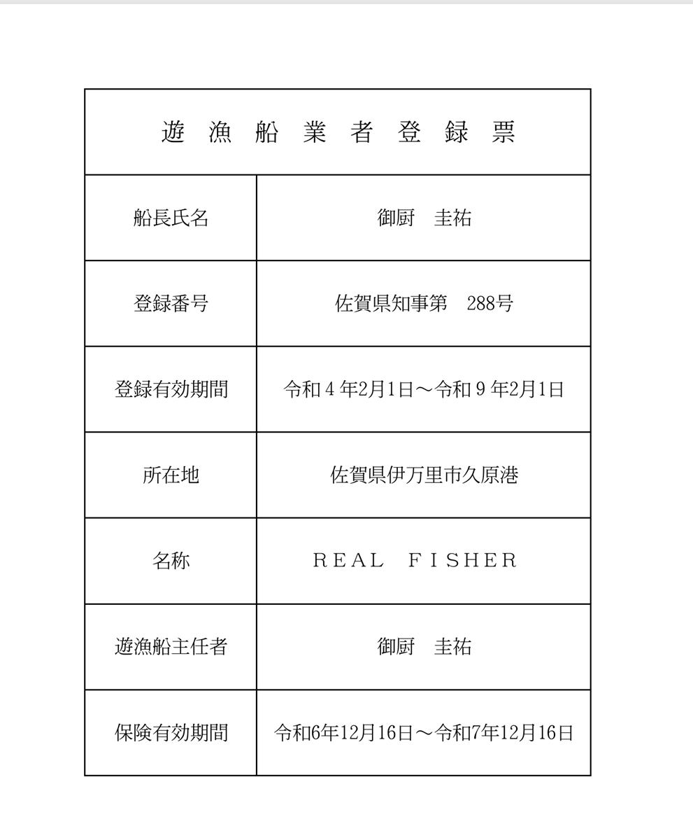 ![]() 船長/ 御厨 圭祐( MIKURIYA KEISUKE ) 遊漁船業務主任者 /遊漁船登録許可 佐賀県知事第288号 時に感動し、時に悔しい思いもありどんな時でも自分を成長させてくれたのが釣りでした。 日々いろんな魚との出会い、そしてお客様との出会いを大切に。 楽しく釣りをしつつ安全に皆様をご案内させていただきたく、いくつかの注意点がございますのでお読み いただければと存じます。 会社概要 会社名 株式会社リアルフィッシャー 代表取締役 御厨圭祐 代表携帯 090-1178-2607 事業内容 遊漁船業/釣具の開発・製造・販売 インボイス登録番号T1300001012954 設立 2022年6月 (遊漁船業2010年2月開始) |
